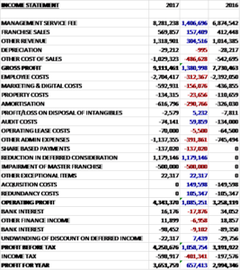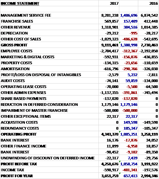 Revenues increased when compared to last year due to a £1.4M growth in management service fees, a £157K increase in franchise sales and a £305K growth in other revenue. Costs of sales increased by £487K so gross profit was £1.4m higher. Employee costs were up £312K, marketing and digital costs increased by £156K, and amortisation grew by £290K. There was £60K less spent on audit services this year but other admin expenses were up £392K. Share based payments were up £137K and there was a £500K impairment of the master franchise agreement but also a £1.2M reduction in deferred consideration, a £150K fall in acquisition costs and a £105K decrease in redundancy costs to give an operating profit £1.1M higher. We see a modest increase in interest costs and a £401K growth in tax charges which gives a profit for the year of £3.7M, an increase of £657K year on year.