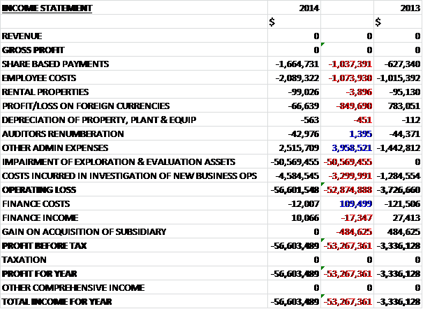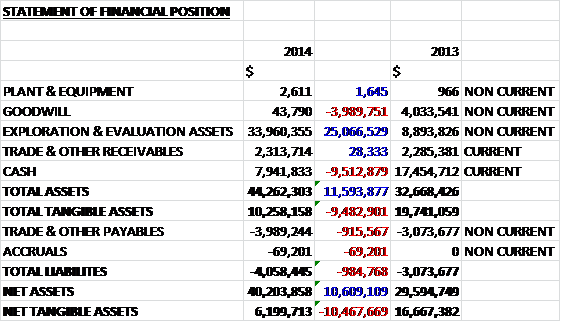 As usual, there are no revenues but we do see a big increase in both share based payments and employee costs. There was also a negative swing to a loss on foreign currencies but these increased costs was counteracted by the “other” admin expenses which relates to the fact that more of these costs were capitalised. There was a $3.3M increase in the costs incurred in the investigation of new business opportunities and a huge $50.6M impairment after the two failed wells in Namibia and Kenya. Finance costs improved considerably but there was a lack of a gain on the acquisition of a subsidiary which occurred last year to give a total loss for the year some $53.3M higher than in 2013 at $56.6M.