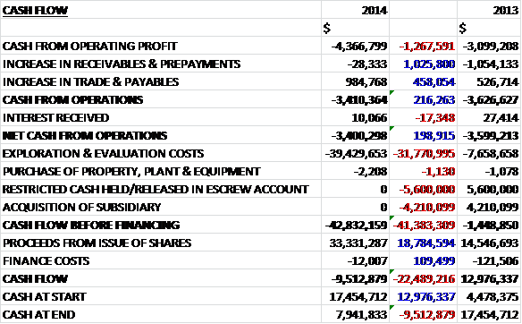 Before movements in working capital, the cash loss increased by $1.3M to $4.4M before a growth in payables gave a net cash outflow from operations of $3.4M, a $216K improvement on last year. The group then spent $39.4M on exploration and evaluation which was partially paid for by proceeds of $33.3M from the issue of shares to give a cash outflow for the year of $9.5M and a cash level of $7.9M at the year-end (which includes some $693K of restricted cash).