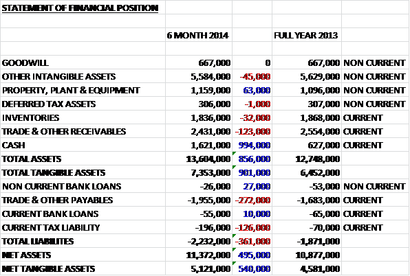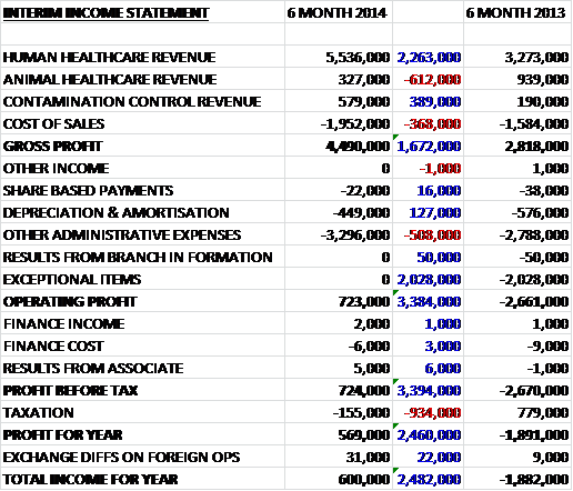 Overall revenues increased fairly substantially. Human healthcare was up £2.3M to £5.5M and Contamination Control more than doubled to £579K but this was mitigated somewhat by a £612K crash in Animal Healthcare revenue. Cost of sales also increased to give a gross profit up some £1.7M to £4.5M. Admin expenses increased year on year, up £508K to £3.3M but the group benefited from the lack of over £2M of exceptional items that occurred last year so operating profit improved £3.4M to £723K. There was a big swing in the amount of tax paid by the group and overall profit for the year stood at £569K, a £2.5M increase on the first half of 2013. Not a bad performance.