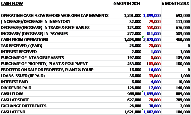 Before working capital movements, the cash flow was a decent £1.2M, which compares well to the £700K outflow in the first half of last year. There was a decent control on working capital, with the group able to increase payables in particular, to give a net cash from operations of £1.6M, £2.1M better than in the first six months of 2013. There was an increase in capital expenditure, and in particular a £185K hike in the purchase of property and equipment, and there was a reduction in the amount paid out in dividends. This meant that the cash flow for the half year was a fairly decent £966K, a whole £1.9M improvement on the situation during the same period of last year.