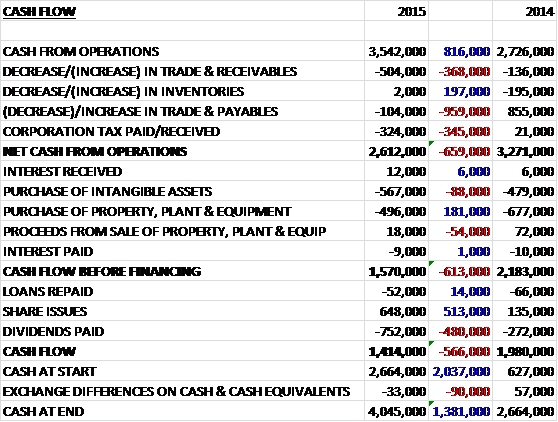 Before movements in working capital, cash profits increased by £816K to £3.5M. An increase in receivables combined with a large swing to a fall in payables and the payment of corporation tax (as opposed to a tax cash receipt last year), however, meant that the net cash from operations was £2.6M, a decline of £659K year on year. The group then spent £567K on intangible assets, and a net £478K on tangible fixed assets to give a few cash flow of £1.6M. Out of this, the remaining £52K loan was repaid and £752K was spent on dividends which meant that after a £648K receipt from share issues, the cash flow for the year was £1.4M to give a cash level of £4M at the year-end.