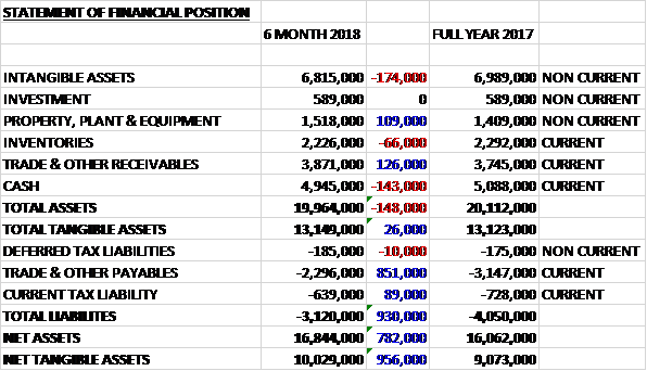 When compared to the end point of last year, total assets declined by £148K driven by a £174K fall in intangible assets and a £143K decrease in cash, partially offset by a £126K growth in receivables and a £109K increase in property, plant and equipment. Total liabilities also declined during the period, mainly due to an £851K decline in payables. The end result was a net tangible asset level of £10M, a growth of £956K over the past six months.