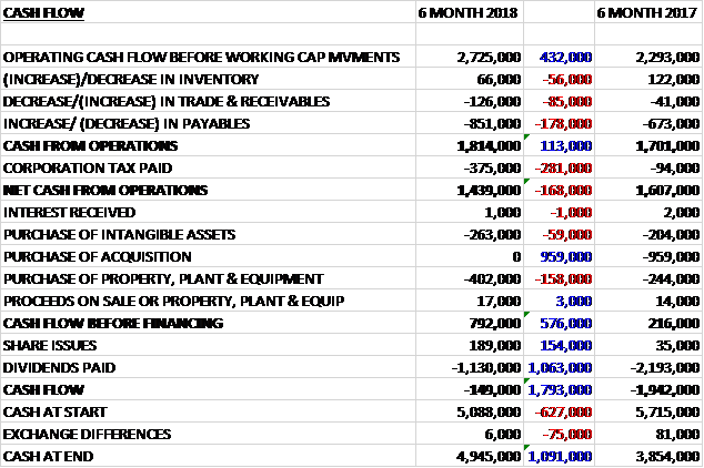 Before movements in working capital, cash profits increased by £432K to £2.7M. There was a cash outflow from working capital and tax payments increased by £281K to give a net cash from operations of £1.4M, a decline of £168K year on year. The group spent £402K on property, plant and equipment along with £263K on intangible assets to give a free cash flow of £792K. This did not cover the £1.1M spent on dividends and there was a cash outflow of £149K for the half year and a cash level of £4.9K at the period-end.