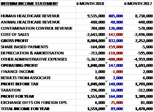 Revenue increased when compared to the first half of last year. Human Healthcare revenue increased by £805K, contamination control revenue grew by £126K and animal healthcare revenue increased by £48K. Cost of sales also increased to give a gross profit £832K higher. Share based payments increased by £159K, depreciation/amortisation was up £118K and other admin expenses grew by £408K, including £500K of costs incurred in the US regulatory programme, giving an operating profit £147K higher. Finance coats were broadly the same and tax charges declined by £16K which meant that the profit for the period was £1.6M, a growth of £164K year on year.
