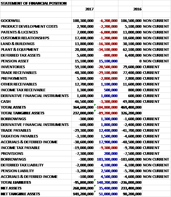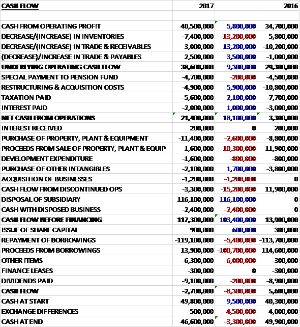 Before movements in working capital, cash profits increased by £5.8M to £40.5M. There was a cash outflow from working capital but this was less than last year. Restructuring costs were £5.9M lower, tax payments fell by £2.1M and interest payments were down £1M to give a net cash from operations of £21.4M, an increase of £18.1M year on year. The group spent £11.4M on property, plant and equipment, £1.6M on development expenditure, £2.1M on other intangibles and £1.2M on acquisitions. They also gained £110.4M from the disposal of the business so before financing there was a cash flow of £117.3M. Of this, a net £105.2M was used to repay borrowings, £9.1M went on dividends and £6.3M on “other items”. This gave a cash outflow of £2.7M for the year and a cash level of £46.6M at the year-end.