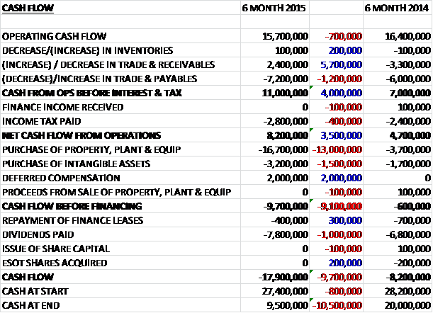 When compared to the end point of last year, total assets at the six month fell by £14.6M driven by a £17.9M decline in cash levels, a £7.3M decrease in goodwill and a £2.4M fall in trade and receivables, partially offset by a £10.8M increase in property, plant & equipment and a £2.2M growth in other intangible assets. Total liabilities also fell as trade & other payables declined by £9.1M, which was the only significant change in liabilities. The end result is net tangible assets that were broadly flat over the last six months, increasing by just £100K.
