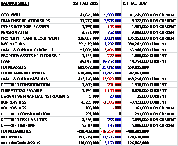 When compared to the end of last year, total assets increased by £29.8M driven by a £19.8M growth in cash, a £5.9M increase in goodwill, a £2.9M growth in property, plant and equipment, a £2.6M increase in franchise relationships and a £1.2M increase in inventories, partially offset by a £2.5M decline in receivables. Liabilities also increased during the period due to a £13.9M growth in payables, a £3.3M increase in borrowings and a £1.2M growth in current taxes payable. The end result was a net tangible asset level of £120M, an increase of £3.2M during the period.
