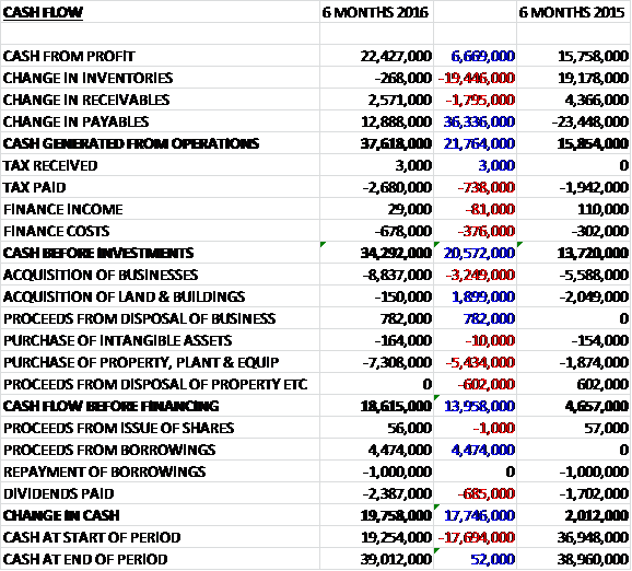 Before movements in working capital, cash profits increased by £6.7M to £22.4M. We then see a large decrease in payables (which seem to be related to lower VAT payments due to fluctuations in new car consignment inventory levels) push the cash generated from operations to £34.3M, an increase of £20.6M year on year. The group then spent £8.8M on acquisitions and £7.3M on property plant and equipment to give a cash flow before financing of £18.6M. We then see a curious increase in borrowings which dwarfed the increase in dividends (presumably the cash level at the period end give a very favourable impression compared to the average cash levels) which meant that there was a cash flow of £19.8M and a cash level of £39M at the end of the half-year.
