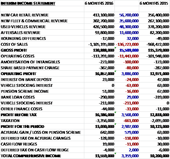Revenues increased when compared to last year with a £56.7M growth in new car retail sales, a £48.3M increased in used vehicle revenues, a £35.6M growth in new fleet and commercial revenue and an £11.6M increase in aftersales revenue. Cost of sales also increased to give a £15.5M growth in gross profit. Operating costs also grew during the period so that operating profit was some £3.9M above that of last time (with new acquisitions contributing a loss of £384K). We then see a negative swing in vehicle stocking interest and an increase in tax which meant that the profit for the period was £13M, an increase of £2.9M year on year.