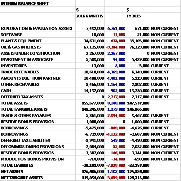 When compared to the end point of last year, total assets increased by $8.1M driven by a $6.8M growth in exploration assets, a $4.5M increase in amounts due from a partner (RSM, received post-period-end), a $4.4M growth in trade receivables (ENEO, also mostly received post period-end), a $2.3M increase in assets under construction and a $1.2M growth in other receivables, partially offset by a $9.2M reduction in the value of oil and gas interests and a $2.2M fall in deferred tax assets. Total liabilities also increased in the period due to a $5M growth in borrowings and a $2.4M increase in payables. The end result was a net tangible asset level of $119.1M, a decline of $5.7M over the past six months.