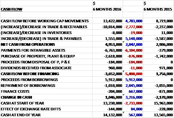 Before movements in working capital, cash profits increased by $4.7M to $13.4M. There was a big cash outflow from working capital due to a growth in receivables reflecting delays in payment from ENEO which has largely been rectified after the period-end, and the net cash from operations came in at $5M, a growth of $2M year on year. The group then spent $6.8M on intangible assets along with $2.6M on property, plant and equipment although they did receive $960K from an associate to give a cash outflow of $3.7M before financing. They took out a net $4.9M of new borrowings to give a cash flow for the period of $1M and a cash level at the period-end of $14.1M.