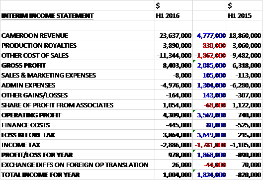 Revenues increased by $4.8M during the period and after royalties were up $830K and other cost of sales increased by $1.9M the gross profit was $2.1M ahead. Admin expenses fell by $1.3M, mainly as a result in a fall in share based payments, and other losses reduced by $143K to give an operating profit $3.6M above that of last time. Finance costs fell by $80K (although finance costs of the facility taken out for the drilling campaign have been capitalised which seems a bit dubious to me) but tax charges grew by $1.8M as the group fully utilised the deferred tax losses previously recognised over unused tax losses in Cameroon, to give a profit for the period of $978K, a positive movement of $1.9M year on year.