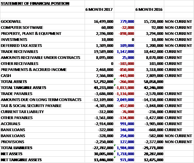 When compared to the end point of last year, total assets declined by £266K driven by an £898K fall in property, plant and equipment, an £850K decline in prepayments and a £443K decrease in cash, partially offset by a £1.1M growth in trade receivables and a £779K increase in goodwill. Total liabilities also declined during the period as a £2M decline in amounts due on long term contracts and a £991K fall in accruals was partially offset by a £1.1M growth in trade payables. The end result was a net tangible asset level of £13.4M, a growth of £971 over the past six months.