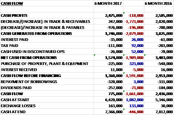 Before movements in working capital, cash profits declined by £110K to £2.5M. There was a cash outflow from working capital and after tax payments fell by £92K the net cash from operations was £1.6M, a decline of £1.9M year on year. The group spent just £225K on capex to give a free cash flow of £1.4M, of which £328K went on loan repayments and £257K was paid out in dividends. This all meant that there was a cash flow of £775K for the period and a cash level of £7.4M at the period-end.
