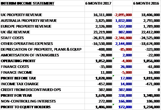 Revenues increased when compared to the first half of last year as a £2.1M reduction in UK property revenue was more than offset by a £1M growth in Australia property revenue, an £807K increase in UK I&E revenue and a £537K growth in European property revenue, aided by forex movements. Staff costs increased by £2.3M but other operating expenses reduced by £2.1M. An £85K growth in depreciation meant that the operating profit was broadly flat, falling by just £4K. Finance costs were down £26K and tax charges fell by £14K before a £307K credit from discontinued operations relating to forex gains on the liquidation of the Moscow entity meant that the profit for the period came in at £1.4M, a growth of £172K year on year.