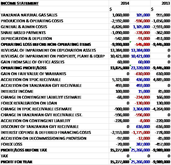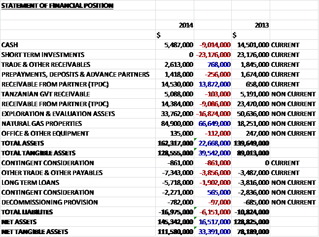 A the year-end the group has cash of $5.5M to fund its planned activities prior to the commissioning of the Mtwara to Dar es Salaam gas pipeline which is expected during Q2 2015. During Q4 2014 they secured two credit facilities totalling $26M with a Tanzanian bank. An amount of $6M was used to pay an existing loan with the remaining facility used to fund development capital within the Mnazi concession in Tanzania. The loan is 48 months in duration and bears interest of 6 months LIBOR rate plus 750 basis points subject to a floor of 8% per annum and a ceiling of 9.5%, which seems like a hefty rate to me. After a grace period of one year, repayments are payable in six semi-annual equal instalments.
