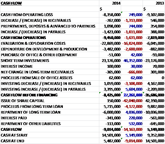 Before movements in working capital, cash losses fell by $749K to $8.4M. A small outflow in working capital, in particular a fall in payables, meant that the cash outflow from operations stood at $9.5M, an increase of $1.6M year on year. The group then spent $22.9M on evaluation and exploration relating to $7.9M on 2D seismic acquisition in Tanzania and $14.1M on exploration drilling in Mozambique, along with $3.5M on development and production relating to $443K on the development well, $1.1M on the field infrastructure connection to the pipeline and $1.9M on other field development, but there was an inward flow from “investing” working capital so that before financing, the cash outflow stood at $31.6M. Surely the $23.2M gained from short term investments is financing, not investment and after taking that into account the cash outflow for the year stood at $9M and the cash level at the end of the year was just $5.5M.