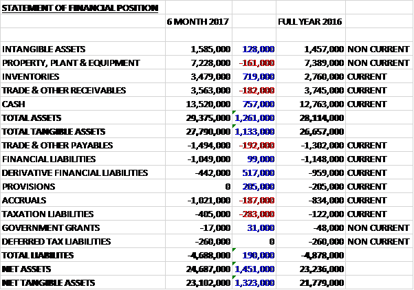 When compared to the end point of last year, total assets increased by £1.3M driven by a £757K growth in cash, a £719K increase in inventories and a £128K growth in intangible assets, partially offset by a £182K decline in receivables and a £161K decrease in property, plant and equipment. Total liabilities reduced modestly as a £283K growth in current tax liabilities, a £192K increase in payables and a £187K growth in accruals were more than offset by a £517K decline in derivative financial liabilities and a £205K decrease in provisions. The end result was a net tangible asset level of £23.1M, a growth of £1.3M over the past six months.