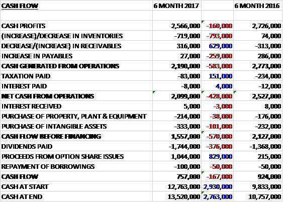 Before movements in working capital, cash profits declined by £160K to £2.6M. There was a cash outflow from working capital but tax payments reduced by £151K to give a net cash from operations of £2.1M, a decline of £428K year on year. The group spent £214K on tangible assets and £333K on intangibles which meant there was a free cash flow of £1.6M. This didn’t quite cover the £1.7M paid out in dividends but the group received £1M in proceeds from share option issues to give a cash flow for the period of £757K and a cash level of £13.5M at the period-end.
