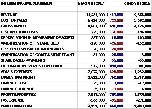 Revenues increased by £1.4M when compared to the first half of last year and with cost of sales only up £722K, the gross profit increased by £691K. Distribution costs were up £31K and there was a loss of £28K from the disposal of intangibles. There was an £898K positive swing in hedging instruments but other admin expenses were p £820K to give an operating profit £763k above that of last time. Finance costs were broadly flat but tax charges grew by £95K which meant that the profit for the half year was £2.2M, a growth of £668K year on year.