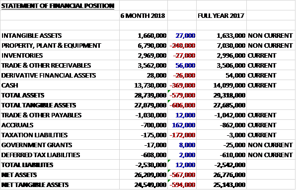 When compared to the end point of last year, total assets declined by £579K driven by a £369K decrease in cash and a £240K reduction in the value of property, plant and equipment. Total liabilities also saw a modest decline as a £172K growth in tax liabilities was offset by a £162K decrease in accruals and some other small reductions. The end result was a net tangible asset level of £24.5M, a decline of £594K year on year.
