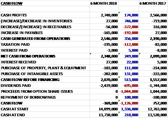Before movements in working capital, cash profits increased by £174K to £2.7M. There was a cash outflow from working capital and a £112K increase in tax payments to give a net cash from operations of £2.3M, a growth of £249K year on year. The group spent £103K on tangible assets and £202K on intangibles to give a free cash flow of £2.1M. Of this, £2.4M was paid out in dividends which meant there was a cash outflow of £369K and a cash level of £13.7M at the period-end.