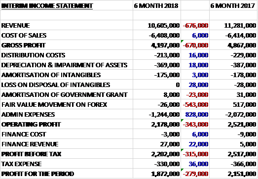 Revenues declined by £676K when compared to the first half of last year and with costs of sales remaining broadly the same, gross profit fell by £670K. There was a modest decrease in distribution costs and depreciation along with no loss on intangible disposals which was £28K last time. We then see a £543K detrimental movement in the fair value of forex hedges offset by an £828K decline in admin expenses to give an operating profit £343K lower. There was a £22K increase in financial revenue and a £36K decrease in tax charges which meant that the profit for the period was £1.9M, a decline of £279K year on year.